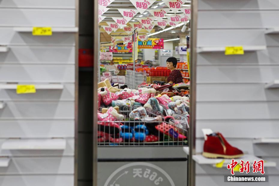 在上海乐天玛特普陀店,只有少数的顾客前来购物,而商场内的许多货架已空空荡荡。 殷立勤 摄