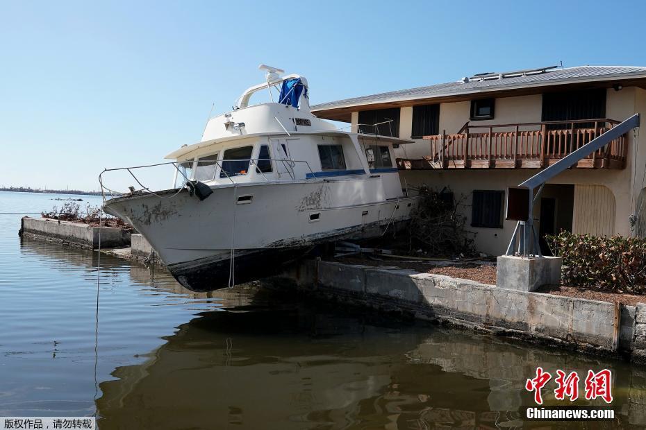 9月17日,美国佛罗里达州,飓风“艾尔玛”过境后,轮船飞身上房。飓风“艾尔玛”是最强的大西洋飓风,它上周登陆美国时为四级飓风,这场飓风造成包括美国和加勒比海地区82人死亡,其中美国佛州超过150万人无电可用,陷入高温热浪的困境。