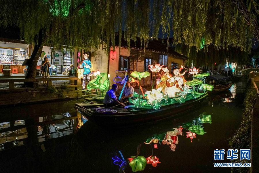 9月18日,一只彩灯扮靓的游船穿行在周庄水巷。