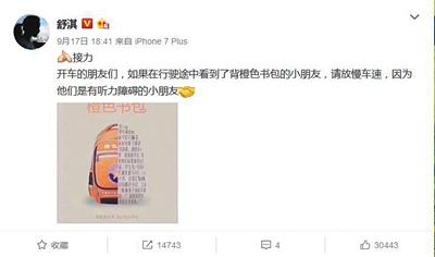 18日开始,多位明星、大V通过微博,转发一则消息,提醒“开车的朋友”,注意礼让背橙色书包的小朋友,“因为他们患有听力障碍”。这一呼吁,随之引发大量转载。