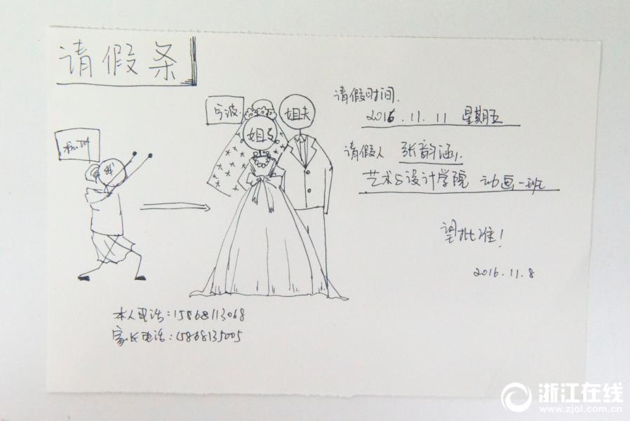 9月19日,在浙江理工大学艺术与设计学院,老师顾红建正在展示学生们交上来的请假条。这些请假条风格多变,充满创意,有简笔画风格的,也有抽象的。比如有学生画了一班开走的列车和一个追赶的小人儿,表示赶不上末班车而迟到;有的把假条做成了贺卡,折页打开一个大红喜字,画上浪漫的婚礼现场,用中英文写上请假“文案”,原来是参加姐姐的婚礼。顾老师说,让学生制作手绘假条,希望学生们学会在生活中用艺术语言叙事,同时也想帮学生们留下大学生活的回忆。浙江在线记者 杨晓轩 李翔 于诗奇 摄 图片来源:浙江在线