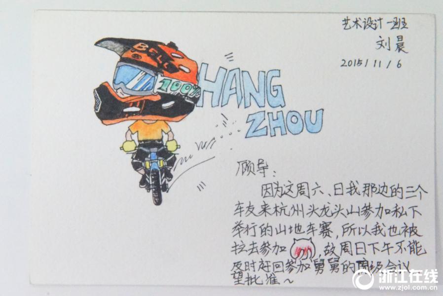 9月19日,在浙江理工大学艺术与设计学院,老师顾红建正在展示学生们交上来的请假条。这些请假条风格多变,充满创意,有简笔画风格的,也有抽象的。比如有学生画了一班开走的列车和一个追赶的小人儿,表示赶不上末班车而迟到;有的把假条做成了贺卡,折页打开一个大红喜字,画上浪漫的婚礼现场,用中英文写上请假“文案”,原来是参加姐姐的婚礼。顾老师说,让学生制作手绘假条,希望学生们学会在生活中用艺术语言叙事,同时也想帮学生们留下大学生活的回忆。浙江在线记者 杨晓轩 李翔 于诗奇 摄 图片来源:浙江在线