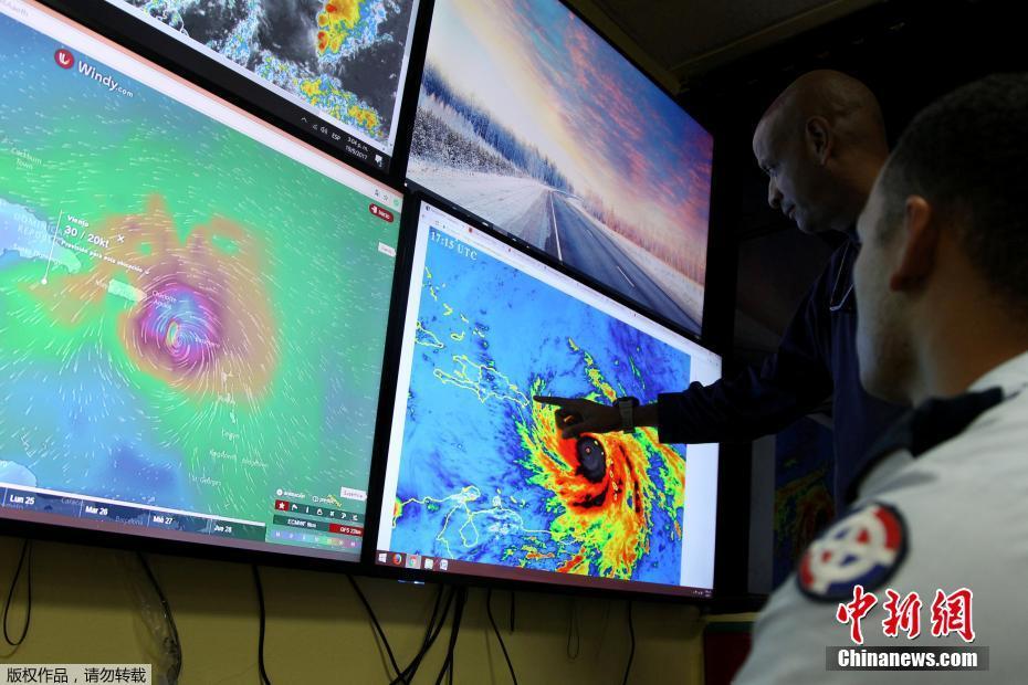 在多米尼加共和国首都圣多明各,紧急行动小组成员正在监测飓风“玛利亚”的动向。