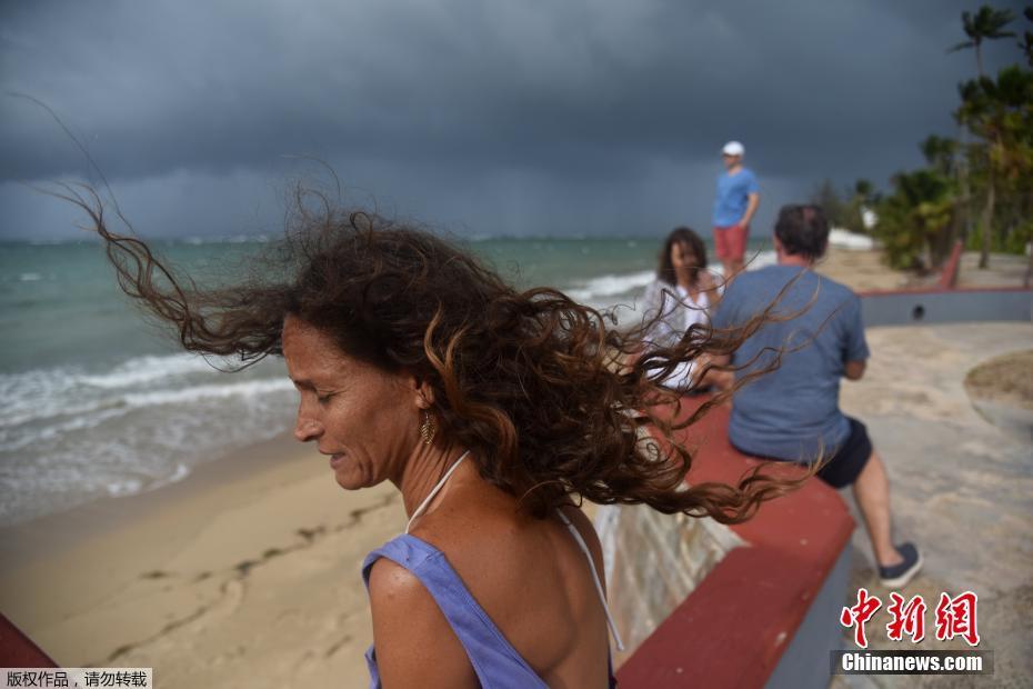 图为波多黎各首都圣胡安海边,当地民众在大风中聚集。