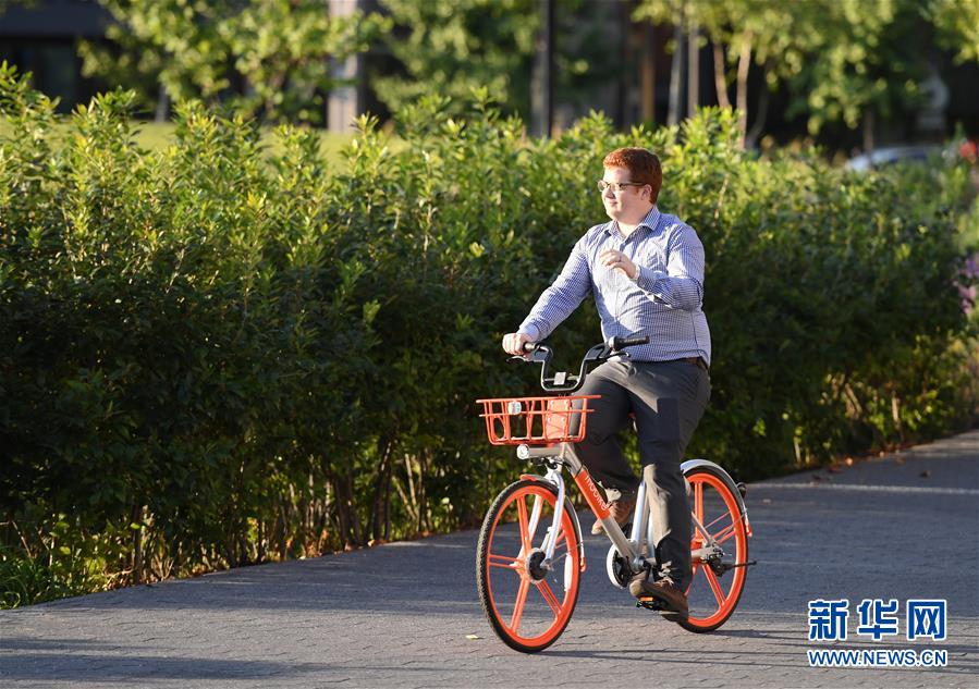 中国共享单车公司摩拜20日正式进入华盛顿,首批投放200辆共享单车供当地民众使用。用户可以用手机搜索离自己最近的单车,费用也通过手机进行电子支付。骑行费用为半小时1美元。新华社记者殷博古 摄