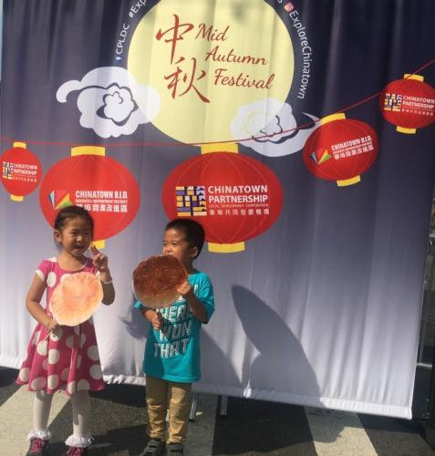 纽约华埠举办庆中秋活动,小朋友们在中秋自拍区玩耍。(美国《世界日报》记者李硕/摄影)