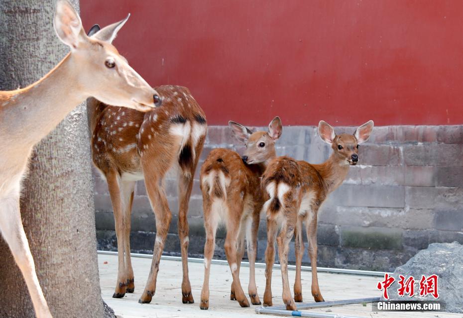 9月21日,9只梅花鹿亮相北京故宫博物院,其中雄鹿2只、雌鹿5只、子鹿2只。承德市文物局与故宫博物院双方决定于2017年9月26日至2018年2月底在故宫博物院慈宁宫花园举办承德避暑山庄内野生梅花鹿展览,为确保鹿只安全和展览顺利进行,还专门选派一名经验丰富的管理人员和一名兽医随行。 中新社记者 杜洋 摄