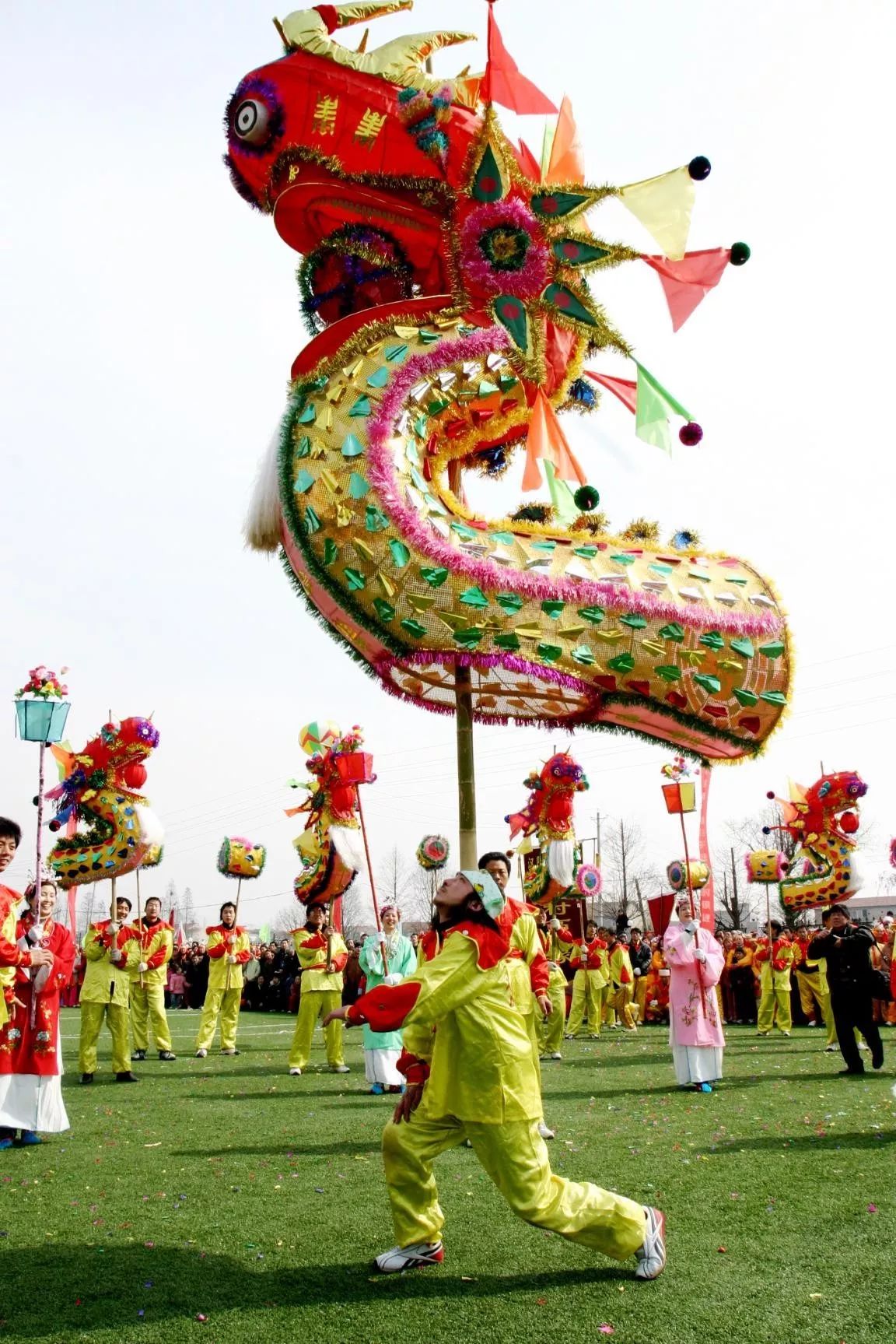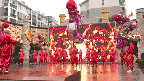 高龙的龙头高4米多,重40公斤,舞起来气势非凡。其中舞龙头的动作套路包括叩高龙、扫高龙、举高龙、抖高龙等,表演者口衔齿托,将几十公斤重的高龙舞得飒飒生风,活力四射。