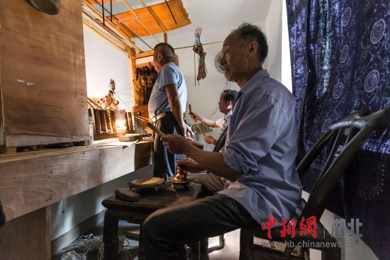 凤娃古镇民俗一条街内,正在表演传统皮影戏的老艺人
