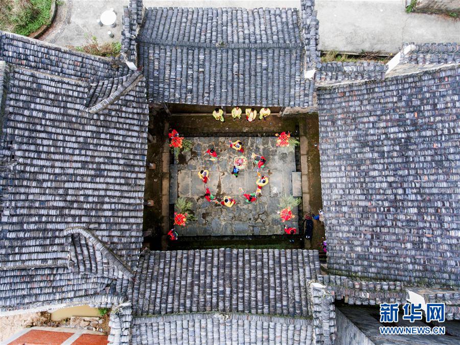 当日,江西省都昌县有着悠久历史的刘溉鼓楼热闹非凡。当地居民聚在一起表演文艺节目,庆祝鼓楼重修完毕,再现风采。刘溉鼓楼位于都昌县土塘镇,建于明代正德年间,由鼓楼、戏台、前厅、后厅等构成,整体为砖木结构,青砖黛瓦,古朴典雅。