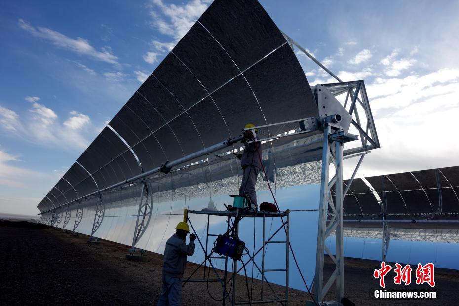 9月23日,位于柴达木盆地的中广核德令哈50兆瓦光热发电项目的工作人员安装集热管。作为中国首座大型商业化槽式光热发电项目,中广核德令哈项目规划装机100兆瓦,一期建设50兆瓦,厂区海拔高度3000多米。建成后每年可节约近6万吨标准煤,节能减排效果显著。中新社记者 孙睿 摄