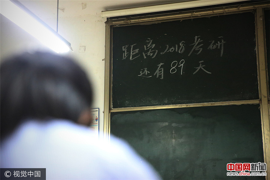 2017年9月25日,安徽阜阳,距考试已不到90天的时间,考研大军重启“高考模式”。在考研自习室的黑板上,每天都更新着剩余复习天数。2018年研究生入学考试将于12月23-25日进行,在最后不到90天的时间里,考研学子想必更是争分夺秒。翟漱文/视觉中国