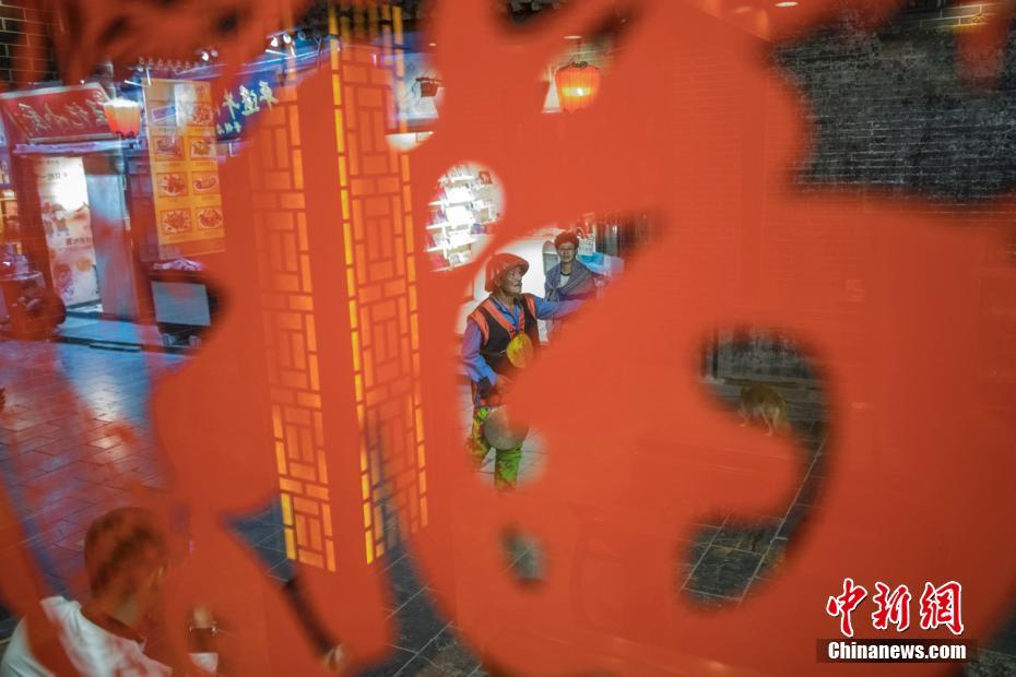 郭维华在古城内巡街打更。郭维华说,古城内有8位打更人,有的工种是报时,有的工种是报平安。“我是报平安的,平安是福嘛!” 泱波摄