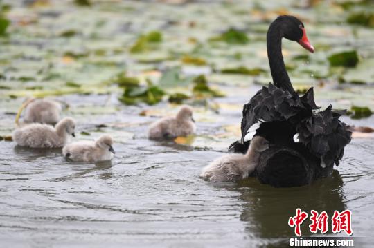 吉大校园黑天鹅“添丁” 五只小天鹅湖中畅游