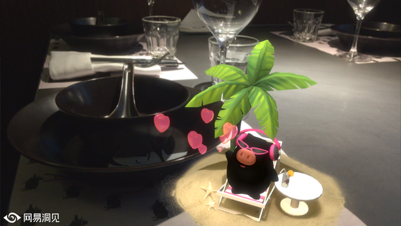 相比许多国际大品牌做过的AR营销,网易味央此次营销又超前了一回。 据了解,市面上常见的AR成像效果通常是“纸片式”的,用户只能看到一个角度。为了提供更逼真的视觉效果,网易人工智能事业部的AR团队,在此次策划中运用了多个创新视效解决方案,在国内餐饮场景中均是首次应用。比如通过业界领先的增强现实(AR)技术,将虚拟的猪小花与真实环境叠加,实现了360°可见,让猪小花的形象明显更加立体、真实。同时,猪小花的每次召唤出场,也充满了魔术般的惊喜效果,譬如桌面会突然发生翻转,让她的生活空间呈现在你面前。这些创新,让猪爸餐厅成为真正意义的中国第一家3D AR餐厅。