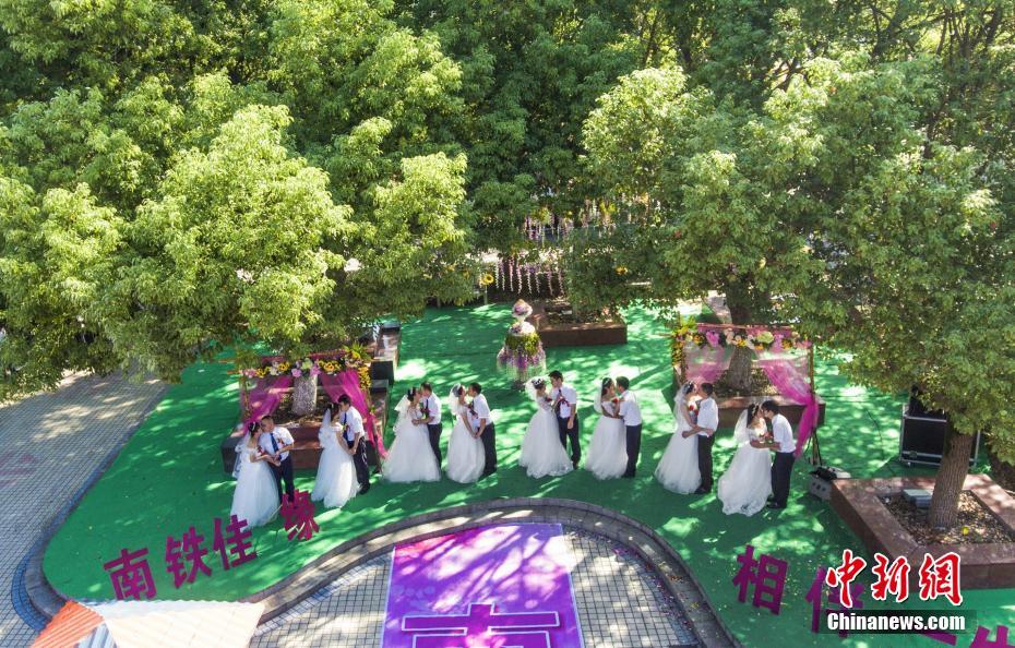 9月26日,8对来自江西省内铁路单位一线生产岗位,分别从事火车司机、车辆检修工种的青年职工,在单位同事、亲朋好友的共同见证下,庄重许下了对彼此挚爱一生的婚誓,将自己的甜蜜幸福与职工同事们一起分享。鲍赣生 摄