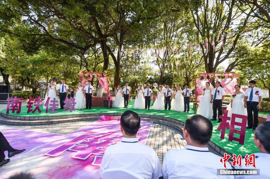 9月26日,8对来自江西省内铁路单位一线生产岗位,分别从事火车司机、车辆检修工种的青年职工,在单位同事、亲朋好友的共同见证下,庄重许下了对彼此挚爱一生的婚誓,将自己的甜蜜幸福与职工同事们一起分享。鲍赣生 摄