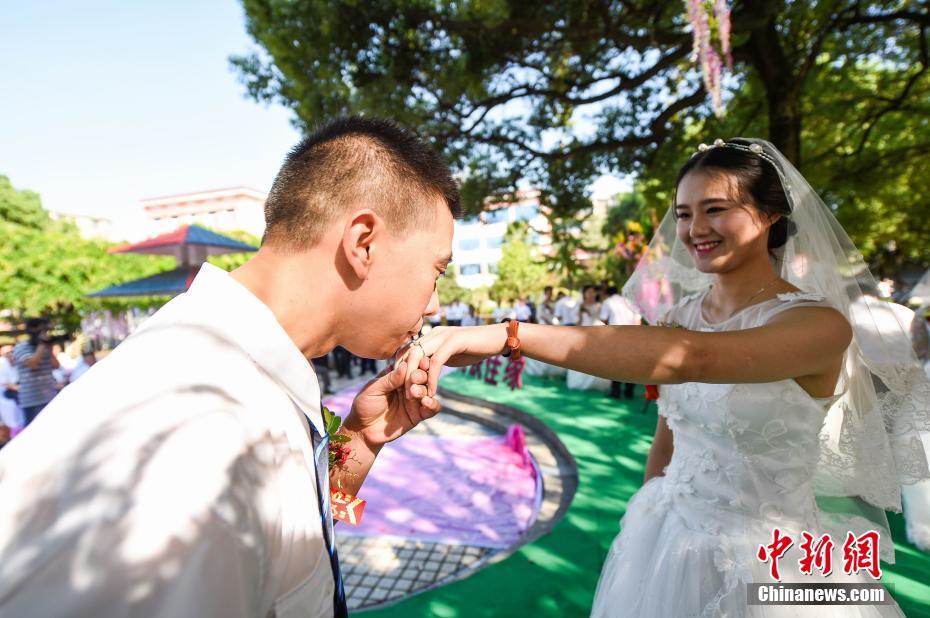 9月26日,8对来自江西省内铁路单位一线生产岗位,分别从事火车司机、车辆检修工种的青年职工,在单位同事、亲朋好友的共同见证下,庄重许下了对彼此挚爱一生的婚誓,将自己的甜蜜幸福与职工同事们一起分享。鲍赣生 摄