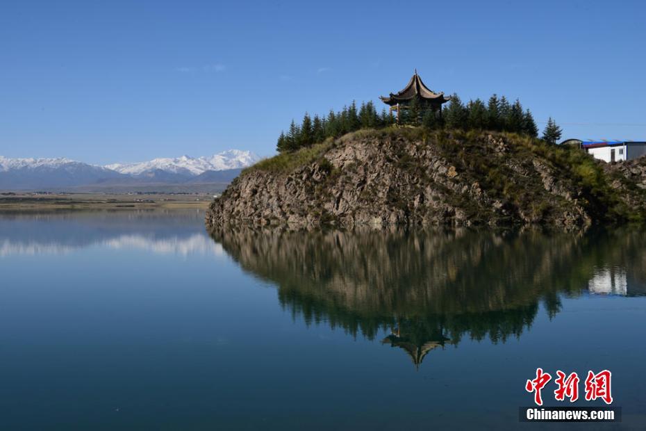 9月26日,受冷空气影响,甘肃肃南裕固族自治县出现雨夹雪天气。一场秋雪过后,肃南县皇城镇夏日塔拉草原银装素裹,美景如画。图为湖水中倒映的美景。武雪峰 摄