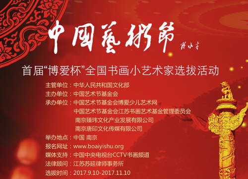 9月23日,中国艺术节基金会首届“博爱杯”全国书画小艺术家选拔活动在南京艺术金陵博爱楼开幕。该活动由文化部主管、中国艺术节基金会主办,博爱少儿艺术网承办。中国艺术节基金会会长田建平、江苏省文化厅徐循华为活动揭幕,法国法兰西艺术院通讯院士高利昂等到会祝贺。