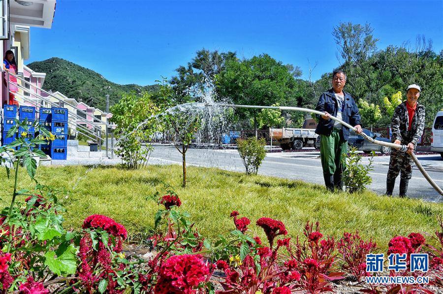 9月28日,铁炉村村民在浇灌新居前的树木和花草。 新华社记者李欣 摄