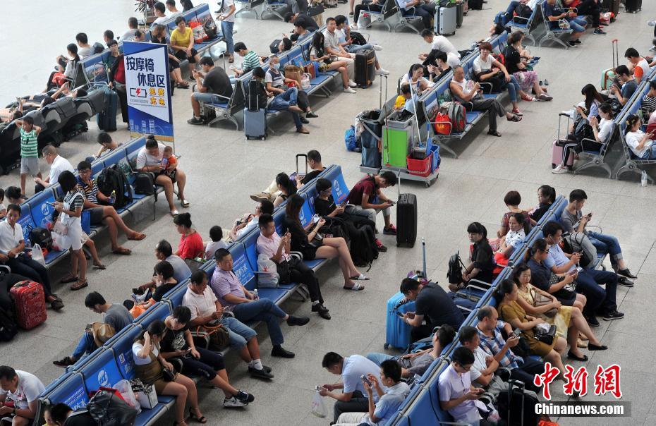 9月28日,旅客在福州火车站候车大厅候车。当日,为期11天的2017年国庆假期铁路旅客运输正式启动,全国铁路预计发送旅客1.3亿人次,同比增加1179万人次,增长10.0%。图为旅客在福州火车站候车大厅候车。张斌 摄