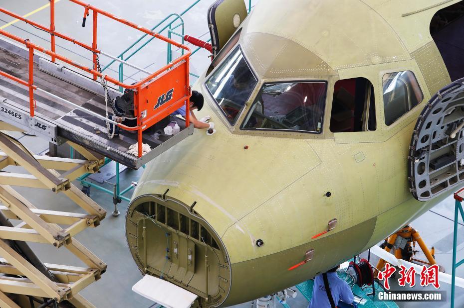 在上海飞机制造公司大场基地,工作人员正在认真的进行总装工作。殷立勤 摄