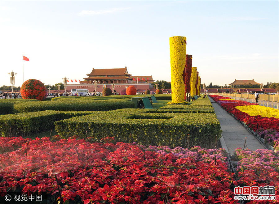 2017年9月28日,北京天安门广场花团锦簇,洋溢出一派节日的喜庆氛围,迎接国庆佳节到来。杜佳/视觉中国