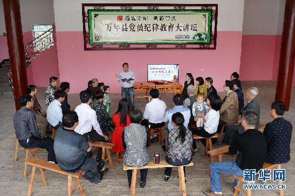 江西省上饶市万年县陈营镇马塘社区纪检监察干事黄中华在为党员和群众做题为“把纪律挺在前面”的专题宣讲(2015年10月28日摄)。新华社记者万象 摄