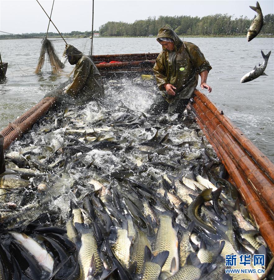 9月29日,安徽省砀山县葛集镇高寨村贫困户在蟠龙湖拉网捕鱼。近年来,高寨村利用丰富的水面资源,引进有实力的水产养殖企业进行综合性渔业经营,采取“现代化经营家门口务工 部分经营收益分红”的模式对贫困人口进行帮扶,带动全村86名贫困人口就业、增收。新华社发(崔猛 摄)