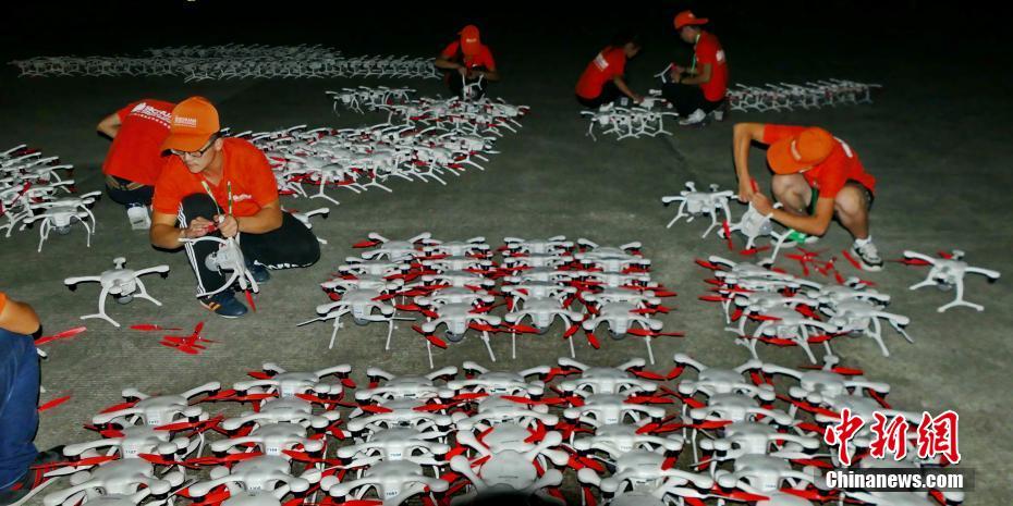 9月29日夜,在四川省广汉市三星堆博物馆,2017四川国际航空航天展无人机专项展的千架微型无人机整装待发,在夜空中展演了一场光影视觉盛宴。中新社发 乔天富 摄