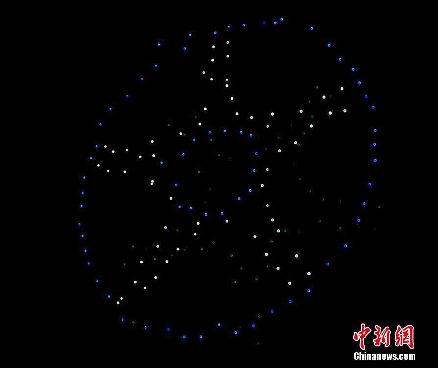 9月29日夜,在四川省广汉市三星堆博物馆,2017四川国际航空航天展无人机专项展的千架微型无人机整装待发,在夜空中展演了一场光影视觉盛宴。图为夜空中无人机组成三星堆青铜太阳轮图案。中新社发 乔天富 摄
