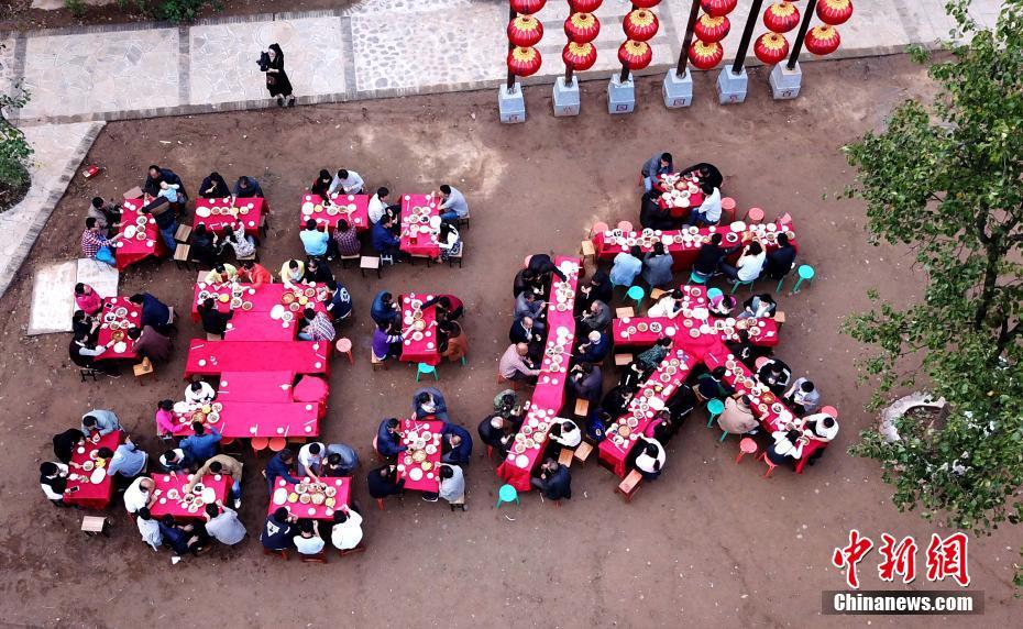 9月29日傍晚,国庆前夕,河南省卢氏县新坪村张灯结彩,百余村民们围坐于村委会门前的百草园广场,他们拿出自家的拿手好菜,手工牛肉丸、熬炒柴鸡、山水老豆腐、粉蒸红薯叶、清炒香菇、清蒸南瓜等几十样的特色美食。聚在一起吃“百家宴”,话家长里短,摆放着美食的桌子围成了巨大的“国庆”字样,场面十分壮观。王中举 摄
