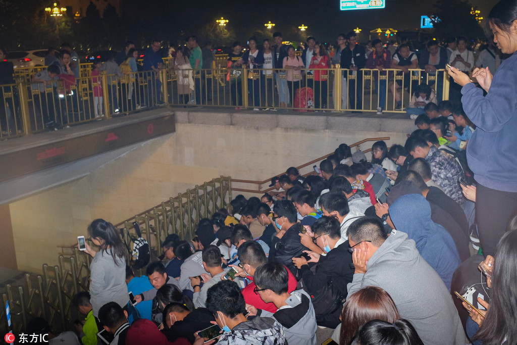 9月30日晚,大量游客来到天安门广场看第二天国庆节的升旗仪式,因未到广场开放时间,游客在过道休息。图为地下通道内的游客。供图:东方IC