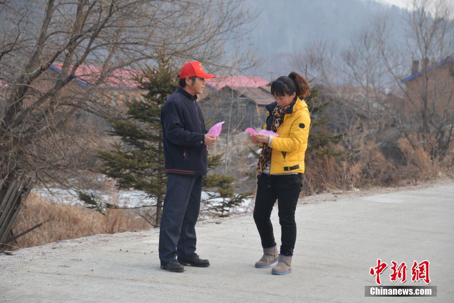 志愿者在保护区附近入户发放保护东北虎宣传单。高海生 摄