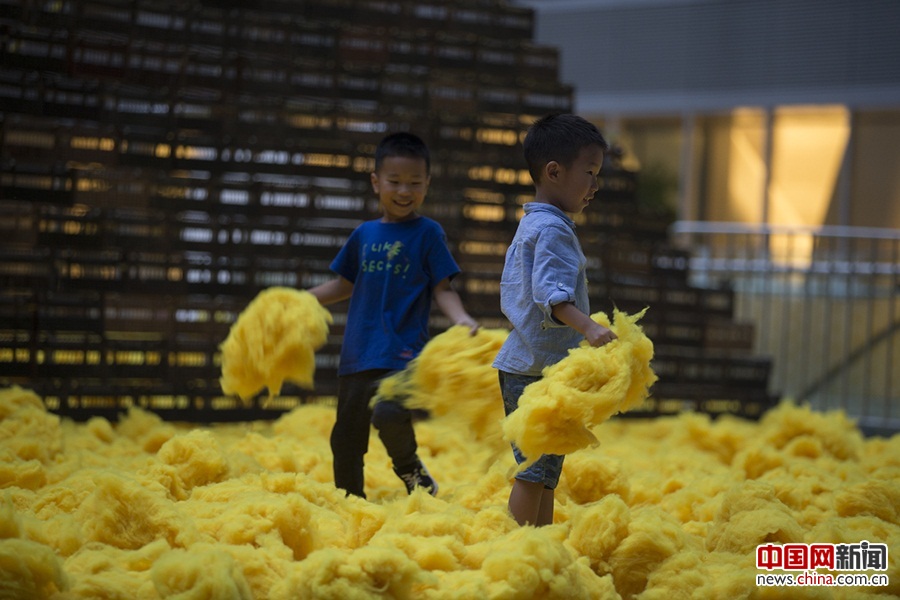 2017年10月1日上午10时,北京国际设计周在北京开幕。图为儿童在艺术家秦树义的互动艺术装置「入口」互动。(活动主办方供图)
