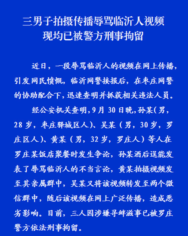 经公安机关查明,9月30日晚,孙某(男,28岁,枣庄驿城区人)、吴某(男,30岁,罗庄区人)、黄某(男,32岁,罗庄人)等人在罗庄某饭店聚餐时发生争论,孙某酒后逞能发表了辱骂临沂人的不当言论,黄某拍摄视频发至其亲属群中,吴某又将该视频转发至两个微信群中,随后该视频在网上广泛传播,造成恶劣影响。目前,三人因涉嫌寻衅滋事已被罗庄警方依法刑事拘留。