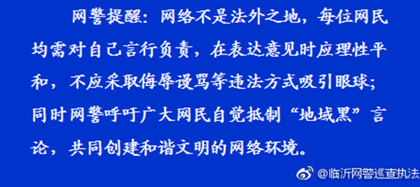 网警提醒:网络不是法外之地,每位网民均需对自己言行负责,在表达意见时应理性平和,不应采取侮辱谩骂等违法方式吸引眼球;同时网警呼吁广大网民自觉抵制“地域黑”言论,共同创建和谐文明的网络环境。