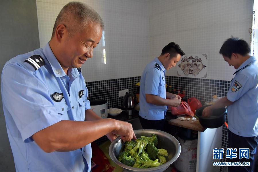 国庆假期第一天,在江西省南昌市新建区南矶乡派出所,不能回家的王云武(左一)和李振林(右一)、夏贤萍一起做饭(10月1日摄)。江西省南昌市新建区南矶乡派出所位于鄱阳湖南矶湿地国家级自然保护区,其所在的南矶乡四面环水,由两个孤岛组成。虽然条件艰苦,但驻守在这里的三位民警王云武、李振林和夏贤萍心无怨言,远离城市和家人,守护一方平安。今年国庆假期,他们用自己的默默奉献和执着坚守,在岗位上为祖国庆生。新华社记者彭昭之 摄