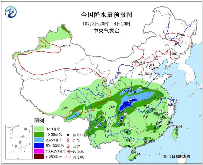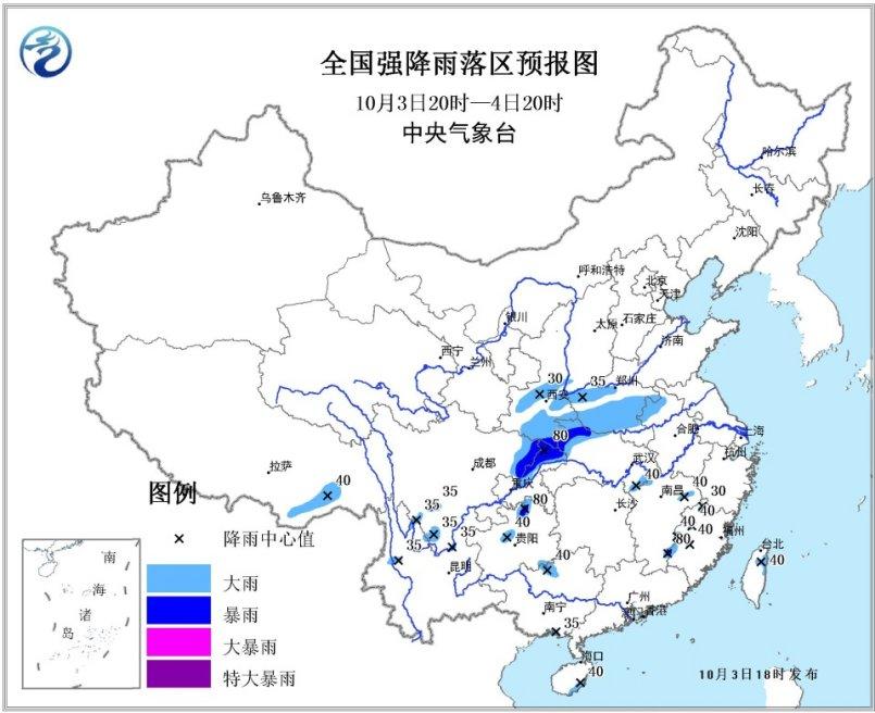 受东移短波槽和低层切变线共同影响,3日夜间至4日,西北地区东南部、西南地区东部、江汉西部、黄淮西部等地有大雨,局地暴雨(50~80毫米)(见图1)。中央气象台10月3日18时继续发布暴雨预报。