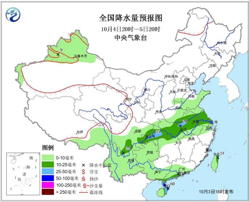 10月4日20时至5日20时,江淮大部、江汉中部、重庆大部、四川南部、广东西南部沿海、海南岛东部等地有中到大雨,局地暴雨(50~60毫米)(见图3)。内蒙古中部、新疆北部和东部等地的部分地区有4~5级风。