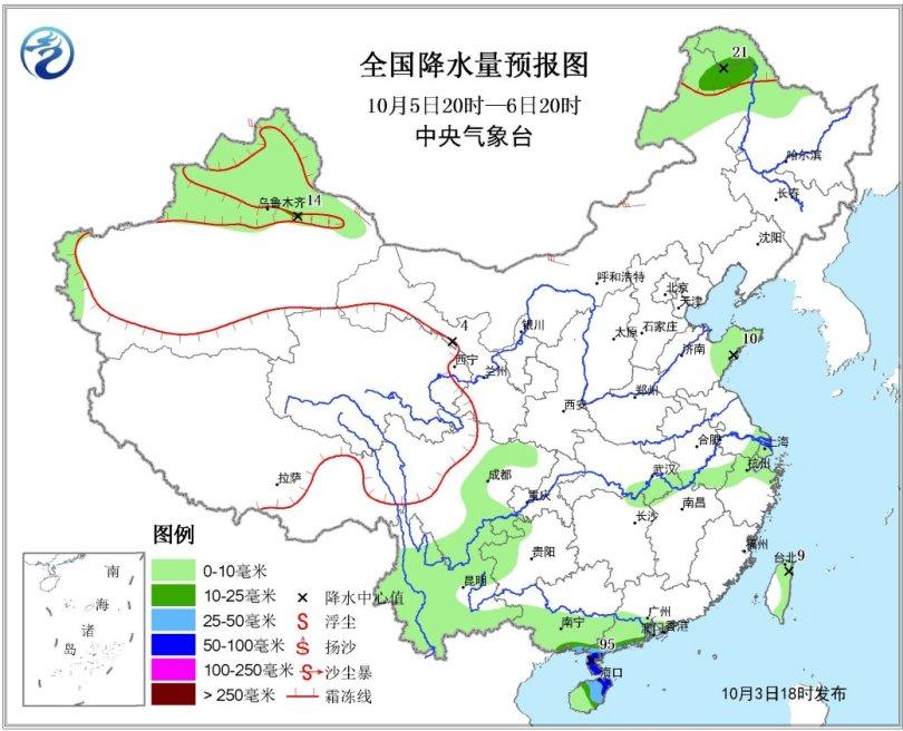 10月5日20时至6日20时,海南岛中东部、广东西南部沿海、广西东南部等地的部分地区有中到大雨,局地暴雨(50~90毫米)(见图4)。内蒙古中东部、新疆北部和东部等地的部分地区有4~5级风。