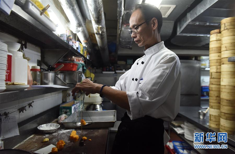 在香港益新美食馆,有着40余年从业经验的周新师傅给月饼馅料称重(9月15日摄)。在香港,奶黄月饼是每年中秋市场的主打产品,为本地食客和各地游客所钟爱。机械化规模生产满足了人们日益增长的需求,但食客们对手工月饼依然情有独钟。一个奶黄手工月饼的诞生,要经过试料、调馅、称馅、包馅等多道工序,非常考验月饼师傅的手工经验。新华社记者刘昀 摄