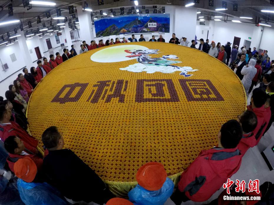 10月4日,农历八月十五,中国传统中秋佳节,河南洛阳老君山由8150枚彩色月饼打造的圆形巨无霸“嫦娥奔月”引民众围观。据了解,8150枚月饼寓意着八月十五,圆形寓意团圆。展示结束后,这些月饼将免费送与游客。王中举 摄