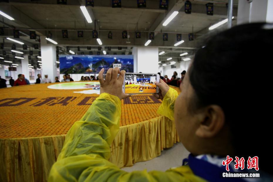 10月4日,农历八月十五,中国传统中秋佳节,河南洛阳老君山由8150枚彩色月饼打造的圆形巨无霸“嫦娥奔月”引民众围观。据了解,8150枚月饼寓意着八月十五,圆形寓意团圆。展示结束后,这些月饼将免费送与游客。图为现场一名民众用手机全景功能拍摄巨无霸“嫦娥奔月”。王中举 摄