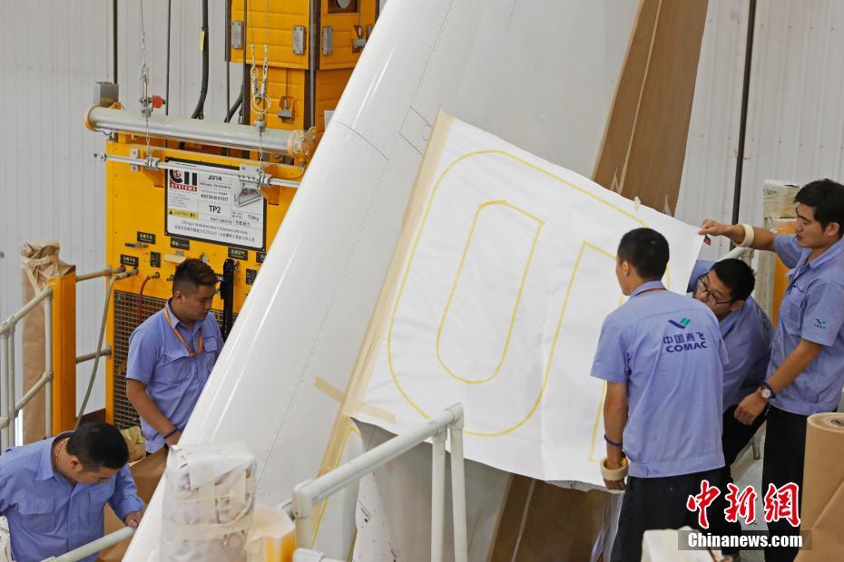 10月5日,在中国商飞上海飞机制造有限公司浦东基地的喷漆厂房车间内,工作人员正在对C919第二架机进行涂装。 殷立勤 摄