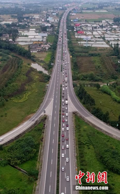 10月5日,四川眉山,成乐高速乐山往成都方向车辆通行缓慢。当日下午17时左右,四川省内成乐高速、京昆广绵、成绵、成雅等多条高速因返程车流量过大,部分收费站实施临时关闭管控措施。中新社记者 刘忠俊 摄
