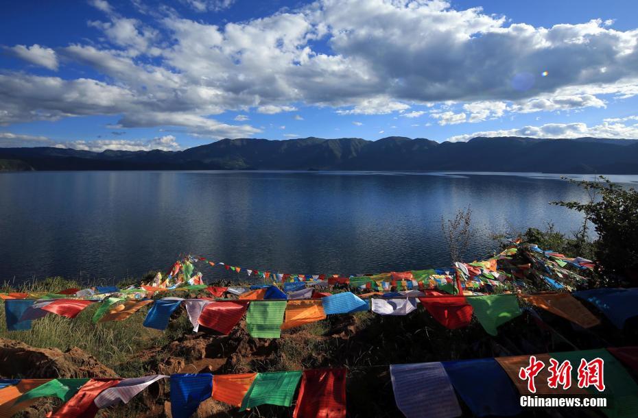 泸源崖上的经幡与天镜般的湖面。 王磊 摄