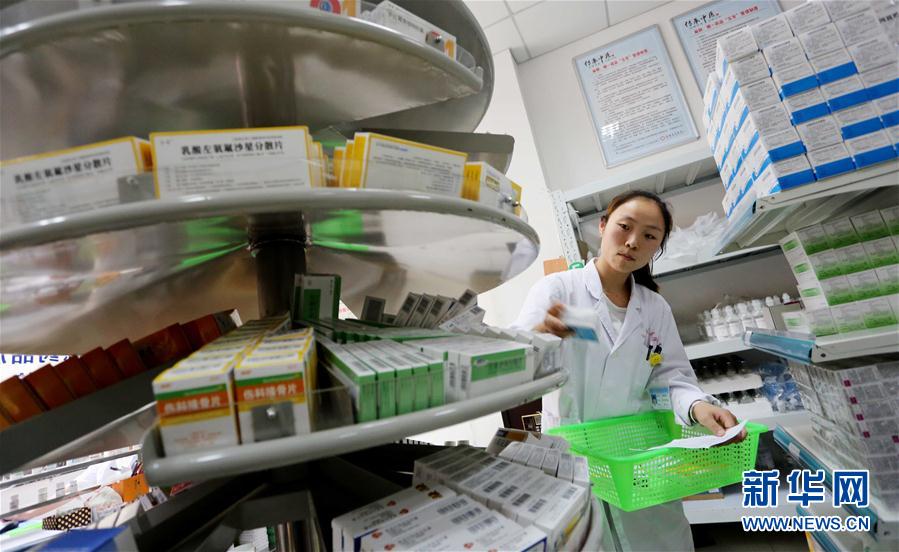 10月3日,江苏省东海县中医院一名工作人员在对照处方抓取药物。