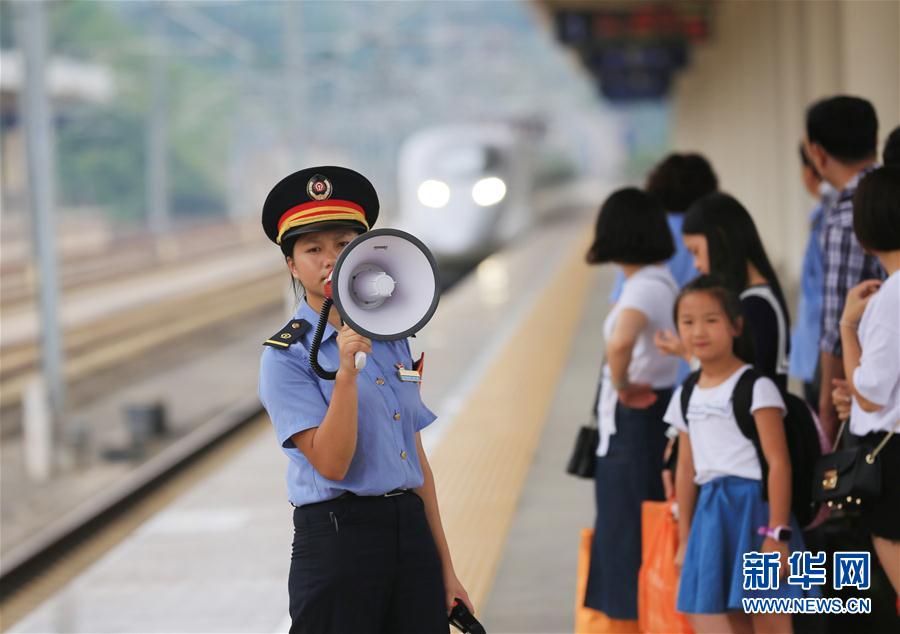 10月2日,在沪昆高铁贵州铜仁南站,铁路职工在组织旅客乘车。